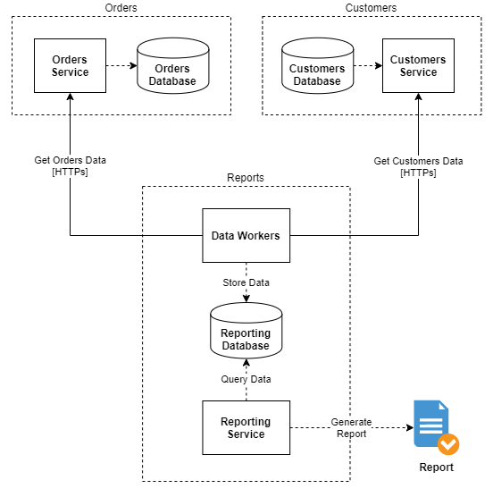 Pomimo prostoty tego rozwiązania, największą jego wadą jest komunikacja synchroniczna. Serwis raportowy musi odpytać API każdej usługi, której dane są potrzebne do wygenerowania raportu. W naszym przypadku są to dwie usługi: Orders i Customers, ale w rzeczywistym systemie z pewnością będzie ich więcej. Ponieważ są to żądania synchroniczne (tutaj HTTP, ale może to też być gRPC lub SOAP zwłaszcza gdy organizacja używa systemów legacy), to musimy czekać na zakończenie każdego z nich i następnie poskładać wszystkie dane w jedną całość co będzie miało duży wpływ na wydajność i responsywność systemu. Raz, że będziemy tracić czas na oczekiwanie na pobranie danych, transformację do modelu raportowego i generowanie wynikowego raportu, a dwa, że będziemy niepotrzebnie obciążać inne usługi poprzez każdorazowe odpytywanie ich API. Oczywiście w niedużych systemach, gdzie raporty nie są złożone i nie są generowane zbyt często to rozwiązanie się sprawdzi bardzo dobrze. Niestety wraz z rozwojem systemu, przyrostem użytkowników i wzrostem złożoności raportów będziemy coraz bardziej obserwować spadek wydajności. Jedni w takiej sytuacji radzą sobie poprzez skalowanie systemu w górę lub wszerz, inni decydują się na zmianę architektury i wdrożenie kolejnych usług, tym razem odpowiedzialnych za wyciąganie danych i zapisywanie ich w dedykowanej bazie raportowej.