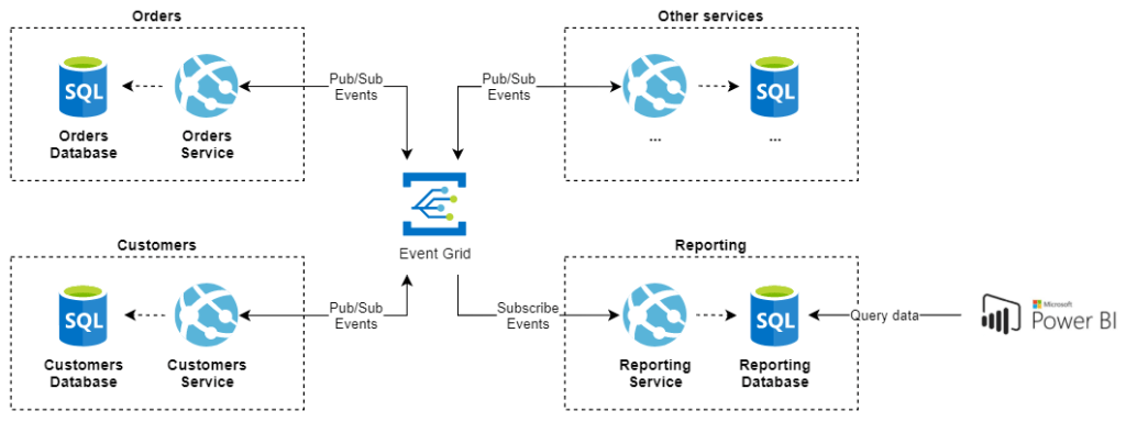 W tym rozwiązaniu usługi komunikują się ze sobą za pomocą usługi Event Grid w modelu Publish/Subscribe. Dzięki temu, wykorzystujemy istniejącą infrastrukturę komunikacyjną i podpinamy kolejną usługę – Reporting Service, której głównym zadaniem będzie nasłuchiwanie na zdarzenia z pozostałych usług i aktualizowanie danych raportowych na podstawie przychodzących zdarzeń z pozostałych usług. Dane te mogą potem zostać wykorzystane przez narzędzia do wizualizacji danych jak SQL Server Reporting Services czy PowerBI. Dzięki zastosowaniu komunikacji asynchronicznej w modelu Publish/Subscribe pomiędzy usługami, jest to stosunkowo mało inwazyjne rozwiązanie, które w niewielkim stopniu wymaga modyfikacji pozostałych usług.