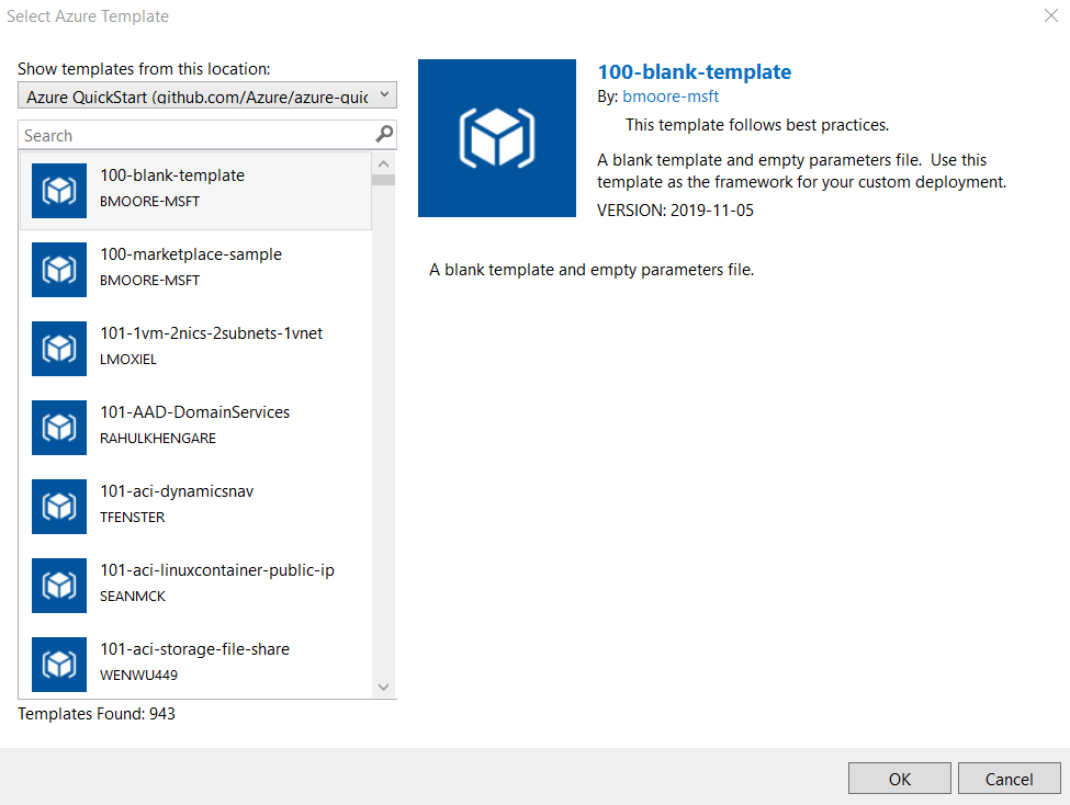 Po podaniu informacji o projekcie takich jak nazwa i lokalizacja zostaniemy poproszeni o wybór szablonu ARM. Możemy zacząć od gotowca lub zacząć od zera i wybrać pusty.