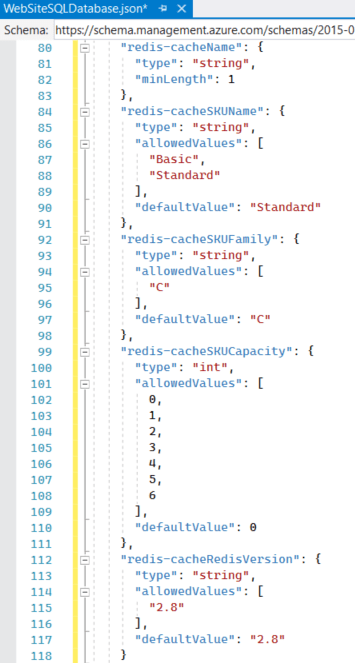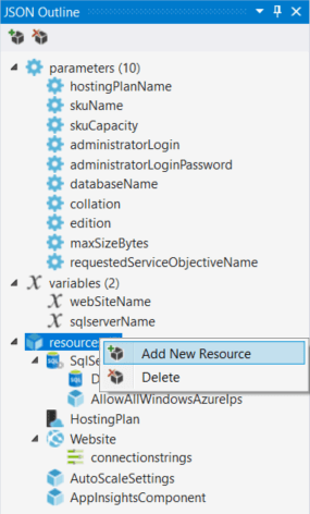 Jak zauważyłem wcześniej ilość atrybutów, którymi możemy opisać zasoby Azure może przyprawiać o ból głowy i powodować trudności w odpowiedzi na pytanie, czy w swoim szablonie powinienem użyć wszystkich atrybutów, czy może wystarczy tylko kilka z nich? Czy muszę mieć pod ręką link do dokumentacji każdego zasobu, żeby wiedzieć jakie atrybuty posiada? Otóż nie do końca. Visual Studio dostarcza okno o nazwie JSON Outline. Jak możemy zobaczyć poniżej wyświetla ono strukturę szablonu w nieco bardziej przystępny sposób.