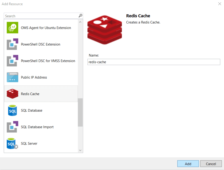 Wybieramy zasób z listy, np Redis Cache i klikamy Add.