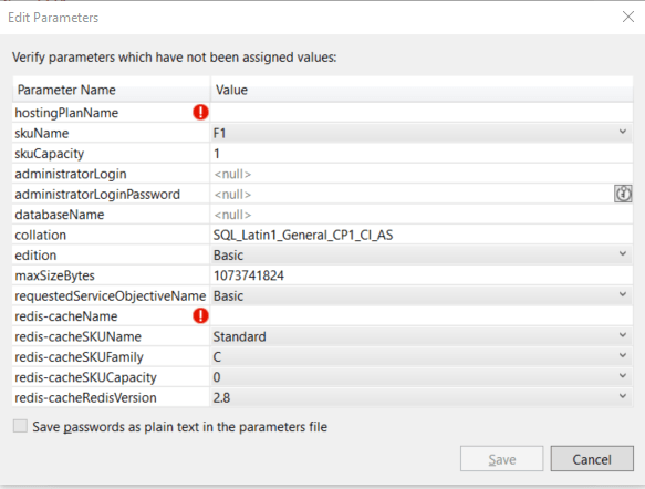 W sekcji parameters możemy zdefiniować parametry, z których będziemy korzystać w dalszej części szablonu, takie jak nazwa aplikacji, lokalizacja, konto administratora, rozmiar bazy danych, pricing plan (darmowy, płatny), itp.