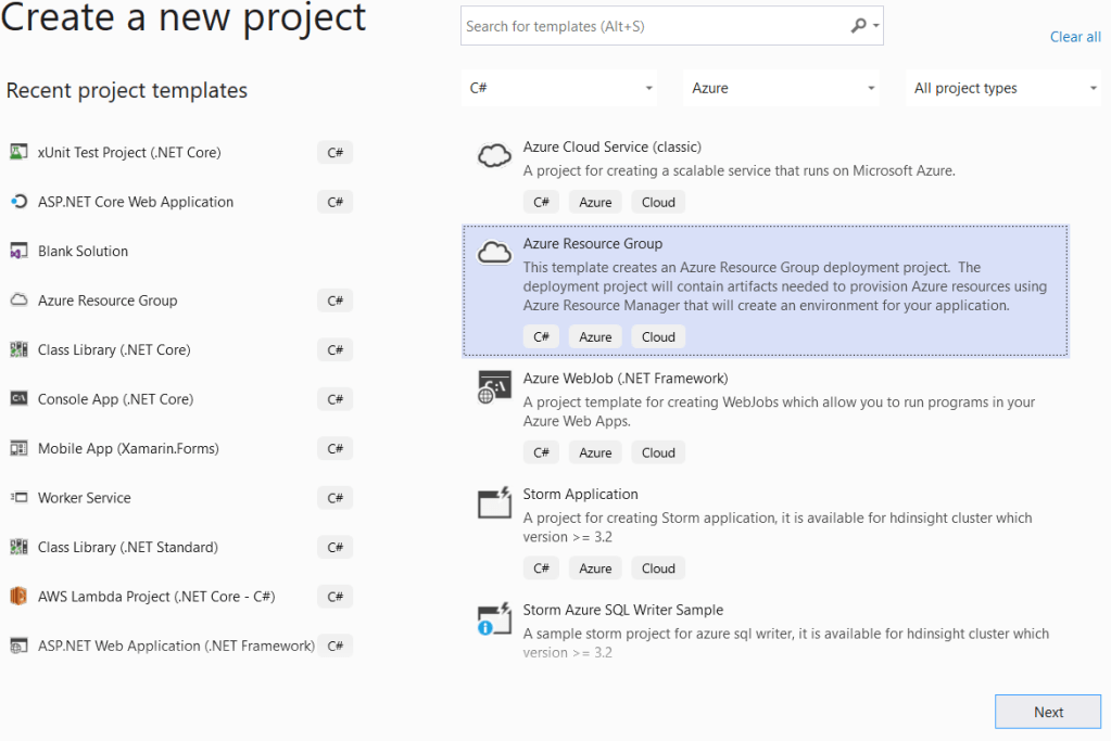 Na szczęście Visual Studio dostarcza nam zestaw szablonów projektów, które możemy wykorzystać do pracy z Azure. VS Code ma podobne udogodnienia, niemniej VS Code jest nastawiony na pracę z edytorem tekstowym i terminalem, dlatego temat VS Code i ARM Templates poruszę w jednym z kolejnych wpisów. Ponieważ chcemy zbudować infrastrukturę wybieramy szablon projektu Azure Resource Group.
